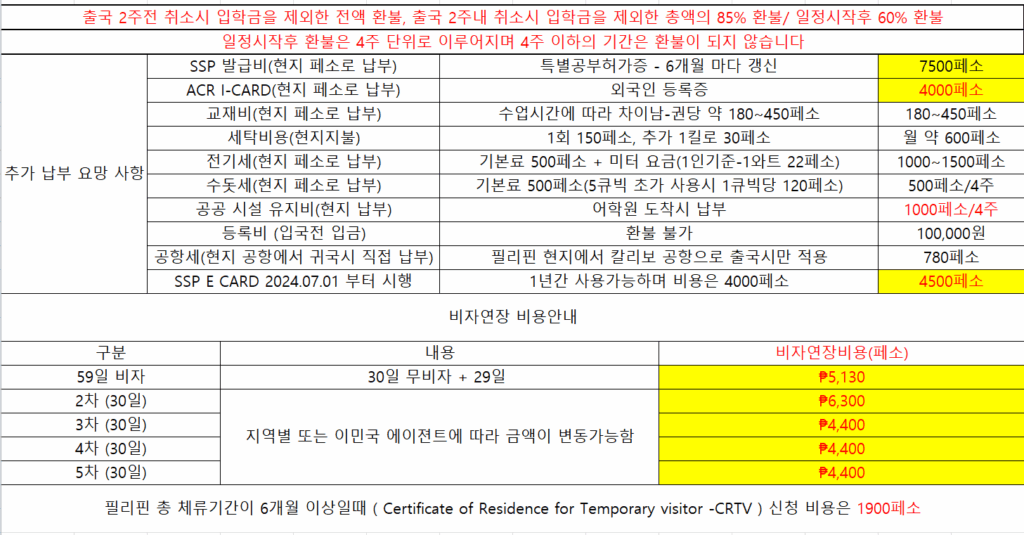 * 현지비용은 필리핀 정부 또는 어학원 자체 규정에 의거해 예고 없이 변경될 수 있습니다.