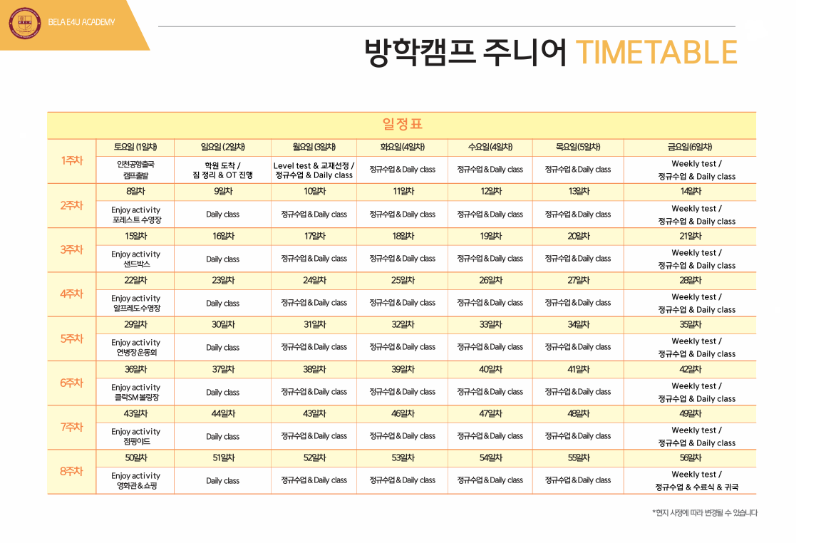 ※ 아래의 시간표는 샘플이며, 표기된 순서대로 수업이 진행되지 않을 수 있습니다.