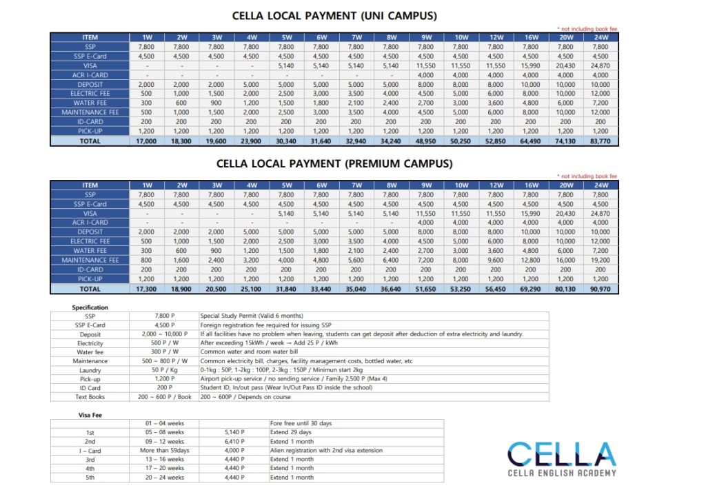 입학금, 학비, 숙식비, 항공료※ 항공료는 유학원에 따라 금액이 달라지지 않으며 개인적으로 발권하여도 무방합니다. |