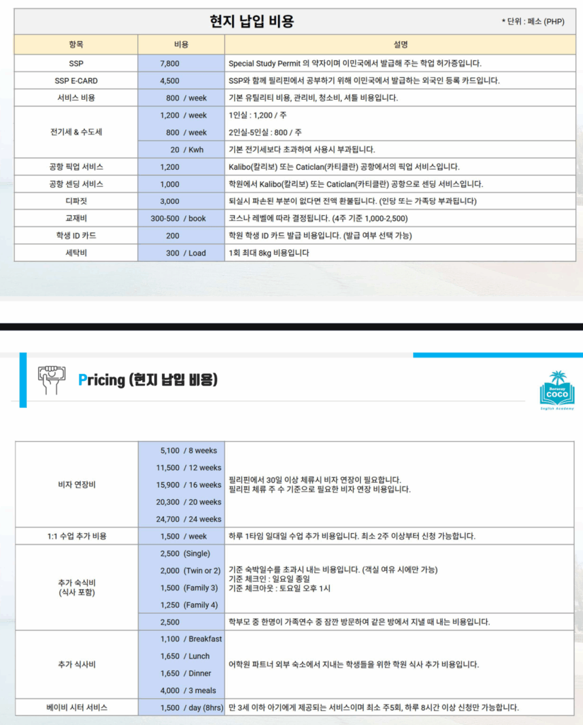* 현지비용은 필리핀 정부 또는 어학원 자체 규정에 의거해 예고 없이 변경될 수 있습니다.