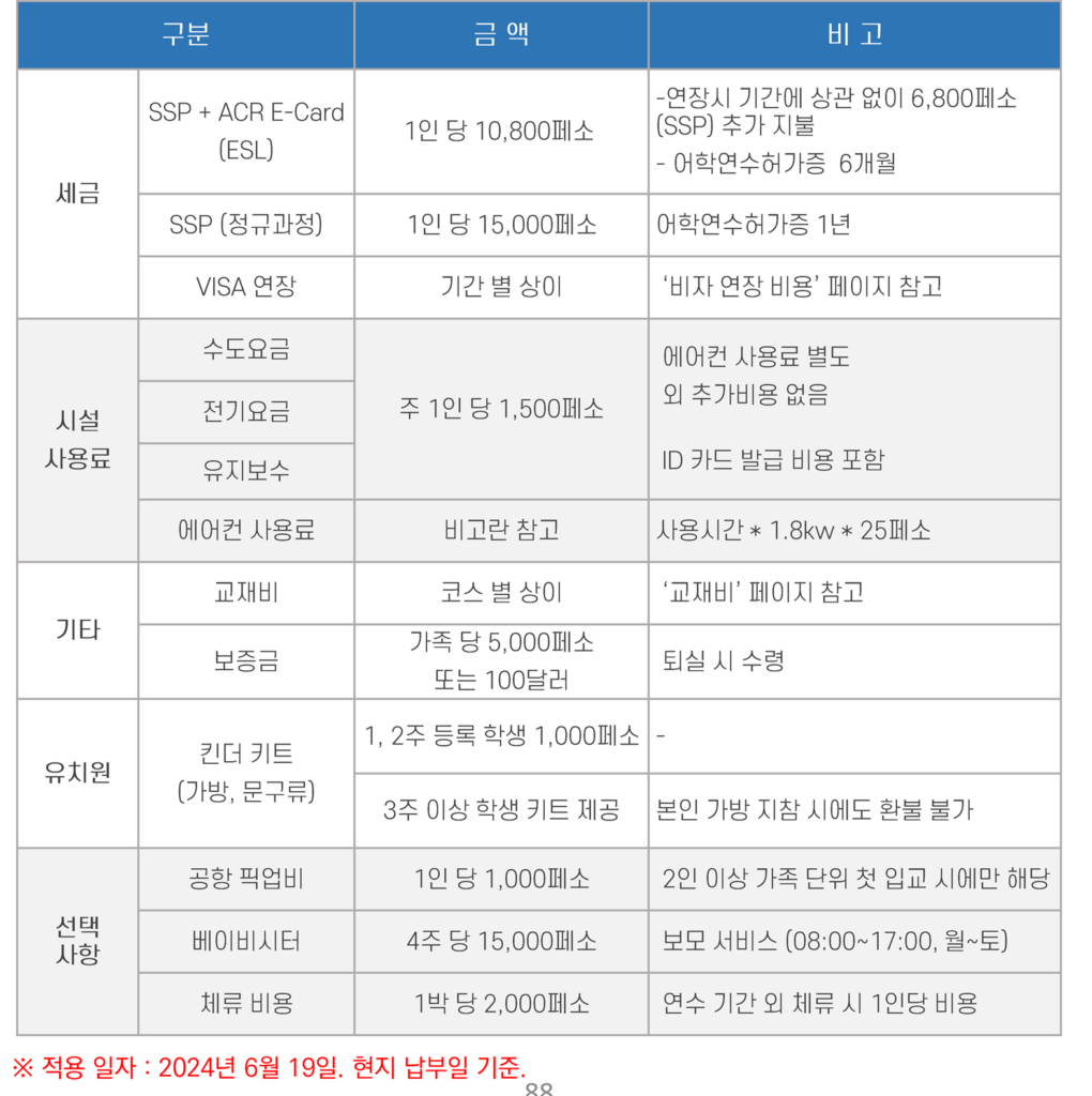 현지비용, 용돈※ 현지비용은 대표적으로 비자비, SSP, ACR-I, 전기세, 수도세, 교재비, 관리비, 픽업비 등 입니다.  |