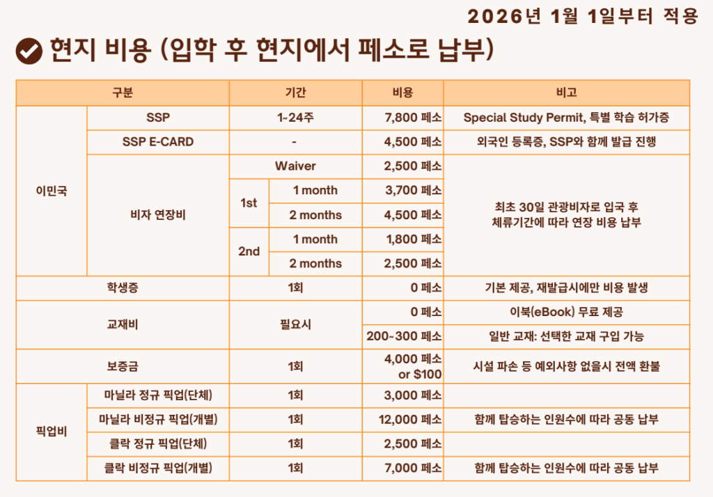 * 현지비용은 필리핀 정부 또는 어학원 자체 규정에 의거해 예고 없이 변경될 수 있습니다.