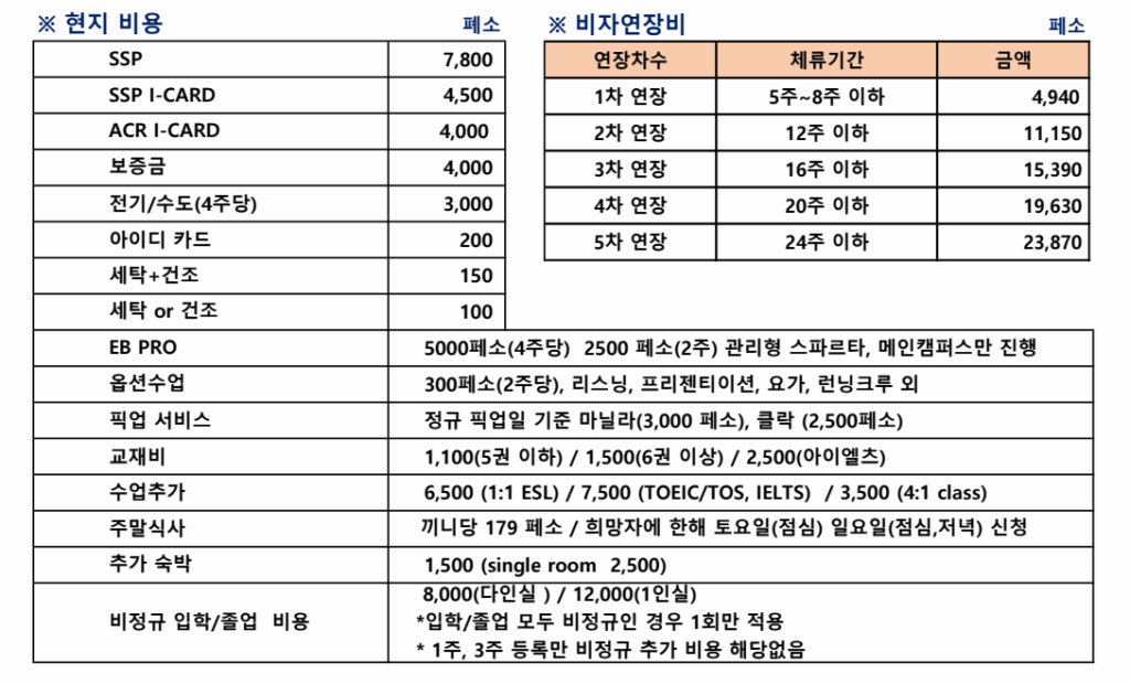 현지비용, 용돈※ 현지비용은 대표적으로 비자비, SSP, ACR-I, 전기세, 수도세, 교재비, 관리비, 픽업비 등 입니다. |