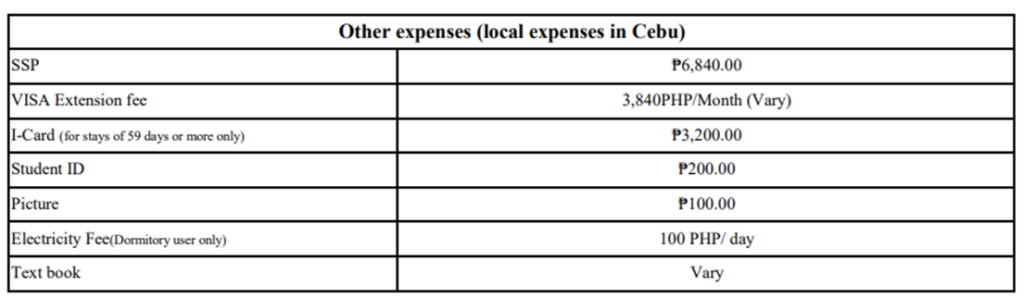 입학금, 학비, 숙식비, 항공료※ 항공료는 유학원에 따라 금액이 달라지지 않으며 개인적으로 발권하여도 무방합니다. |