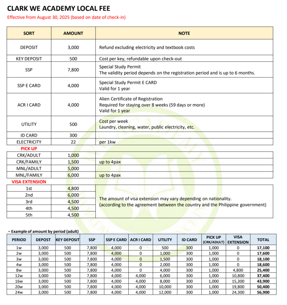 ※ 현지비용은 대표적으로 비자비, SSP, ACR-I, 전기세, 수도세, 교재비, 관리비, 픽업비 등 입니다.