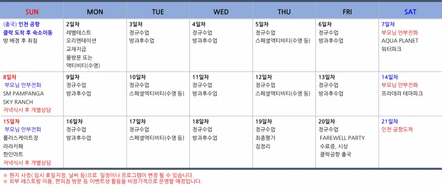 – 불포함: 개인용돈(4주 $150), 여행자보험, 항공료